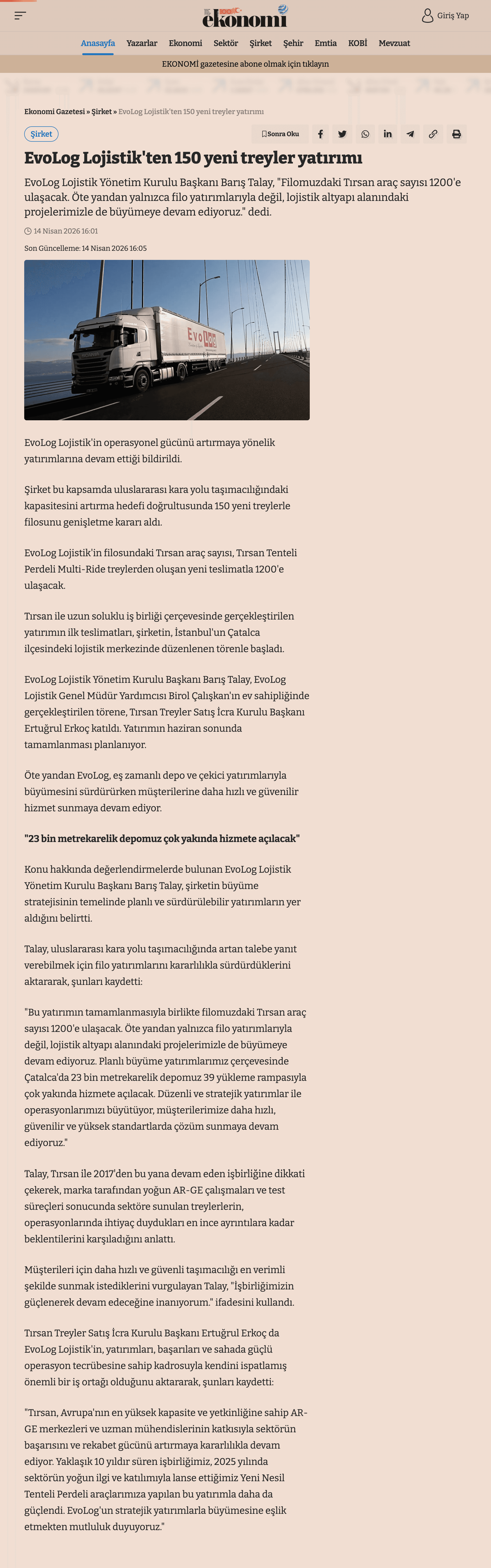 EvoLog Lojistik'ten 150 yeni treyler yatırımı